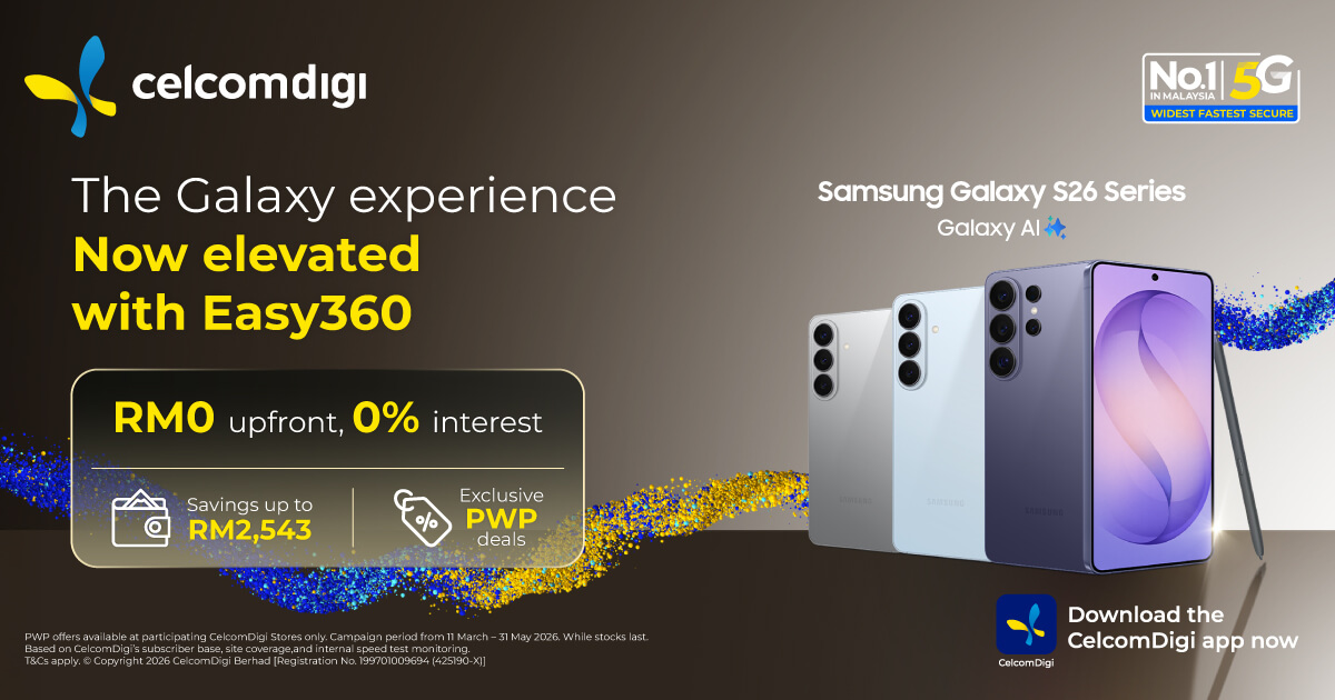 Get Samsung Galaxy S26 Ultra, S26+ or S26 with CelcomDigi. Enjoy up to RM2,543 in value, Easy360 instalments, trade-in bonuses and exclusive launch offers.